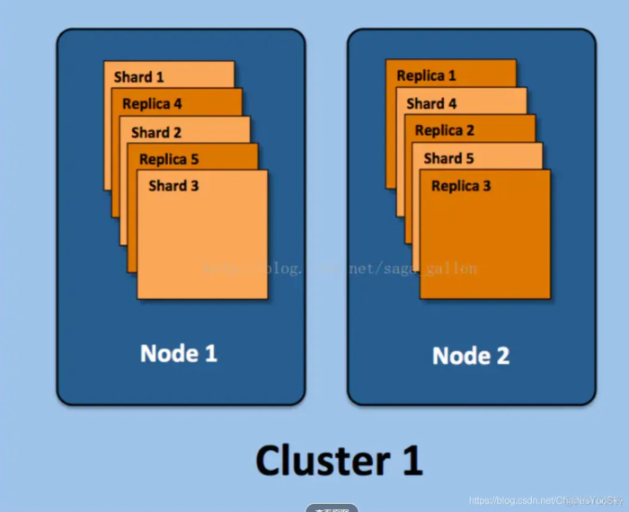 副本(replica) :ES默认为一个索引创建5个主分片, 并分别为其创建一个副本分片. 也就是说每个索引都由5个主分片成本, 而每个主分片都相应的有一个copy.对于分布式搜索引擎来说, 分片及副本的分配将是高可用及快速搜索响应的设计核心.主分片与副本都能处理查询请求, 它们的唯一区别在于只有主分片才能处理索引请求.在上图示例中, 我们的ElasticSearch集群有两个节点, 并使用了默认的分片配置. ES自动把这5个主分片分配到2个节点上, 而它们分别对应的副本则在完全不同的节点上. 对,就这是分布式的概念.